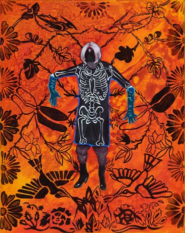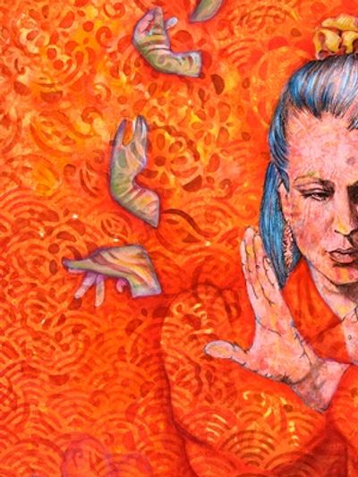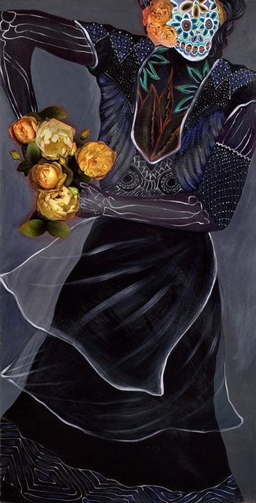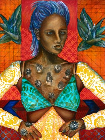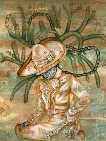 Las Damas del Desierto (Ladies of the Desert) is a series of mixed-media paintings created to honor the six different cultures that have combined to create the Tucson, Arizona of today. The cultures are: The Tohono O'odham Nation, indigenous desert dwellers of the region., Mexico, the country that 'owned' this area at one time before USA took over the region, Spain who sent her missionaries to the area to found missions, build churches and attempt to convert other area inhabitants, China, whose citizens were brought from California and the Pacific Northwest to build the railroads, African-Americans who settled here as Buffalo Soldiers and later, came to work with the military at Davis Monthan Airforce Base. And of course, Caucasians who came as cowboys & settlers and other capacities as the Wild West was being won, so to speak.
